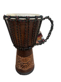 • Beginner djembe from Indonesia • Made of a piece of mahogany wood with carvings • The popular entry-level model with a white goatskin
